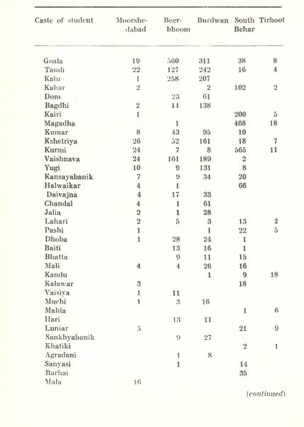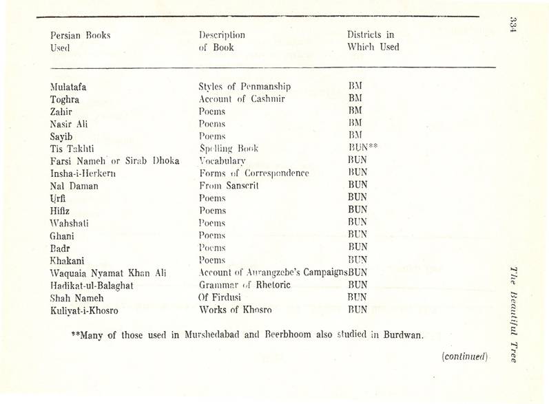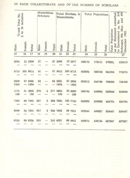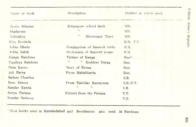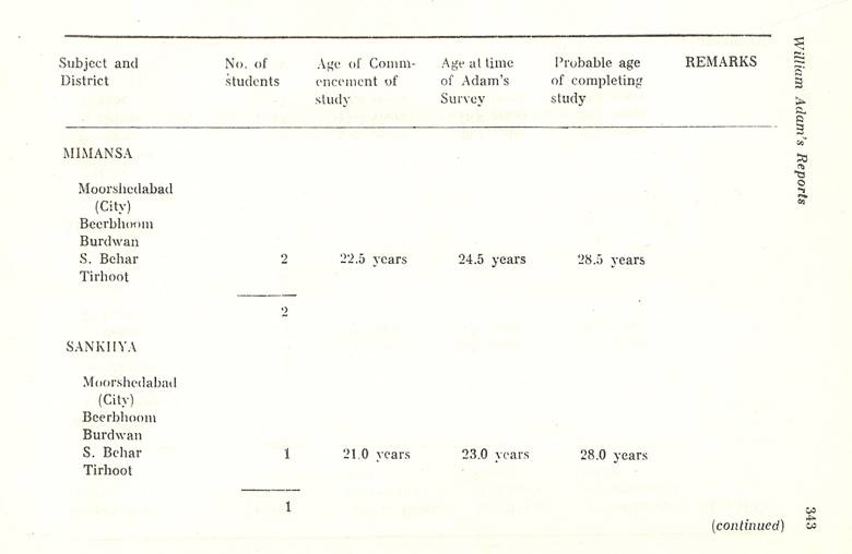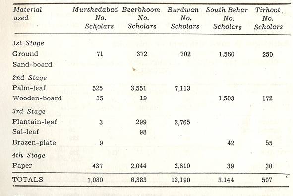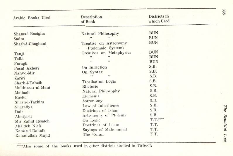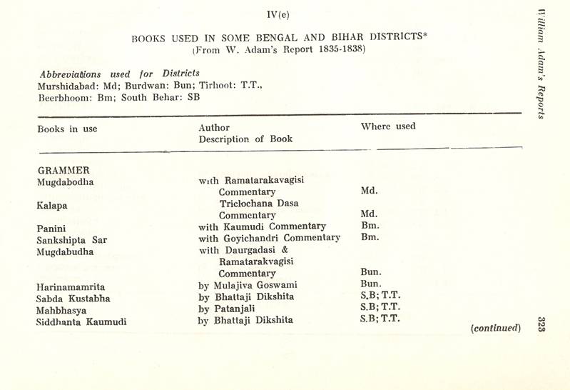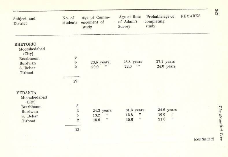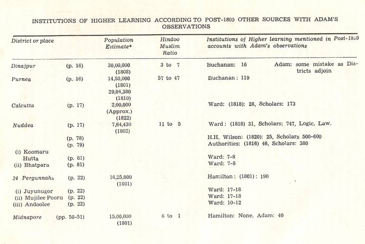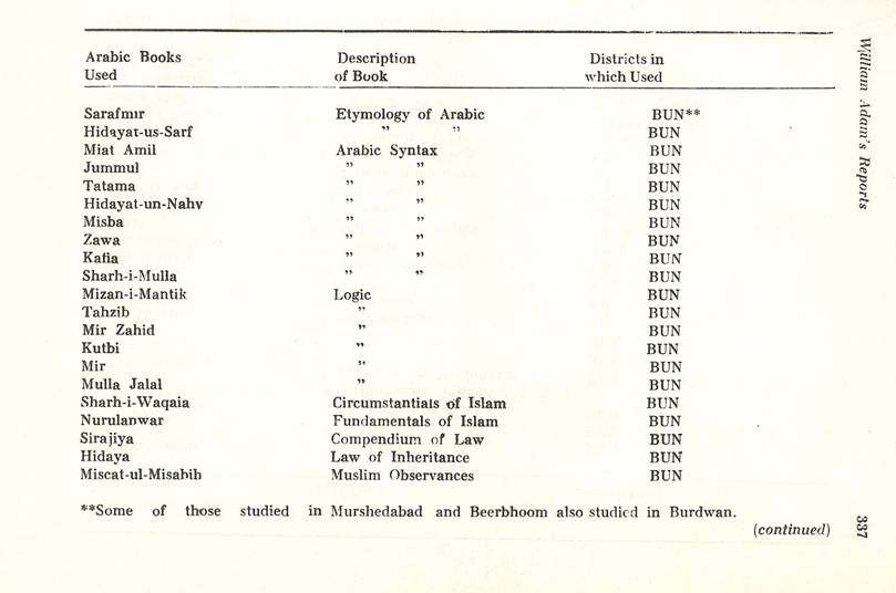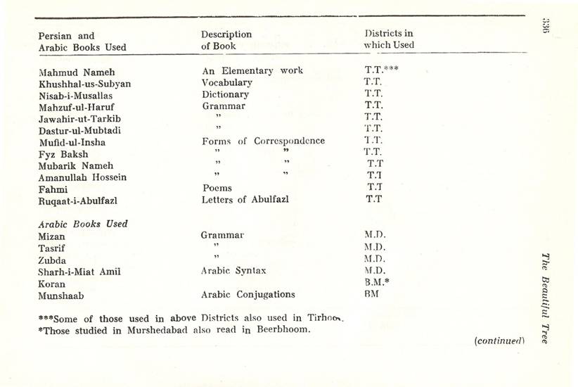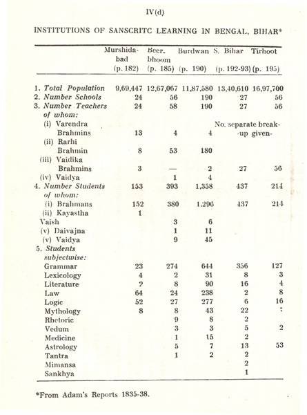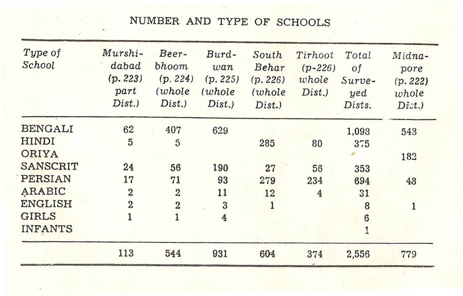 Schools of Learning, 297-316; Backergunge, 305-306; Beerbhoom, 308-310, Burdwan, 297-298; Chittagong 306; Dacca and Jalalpur, 305; Dinajpur, 312-314