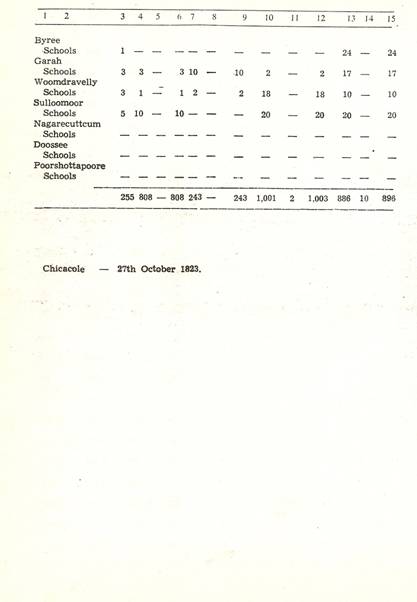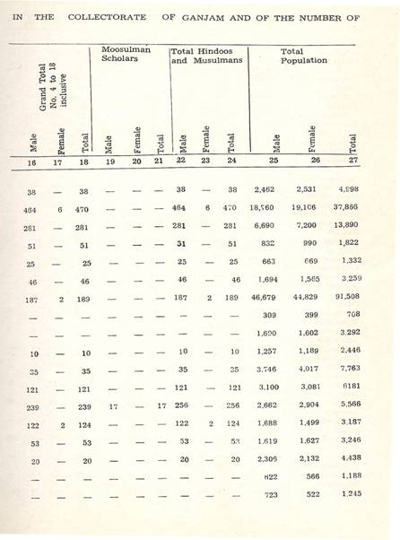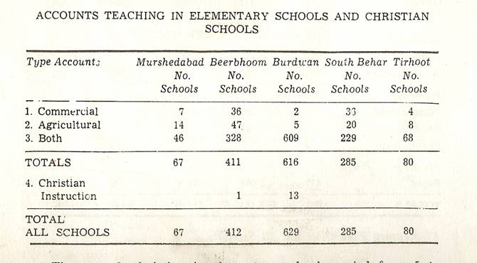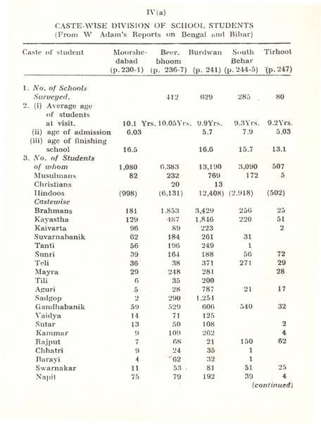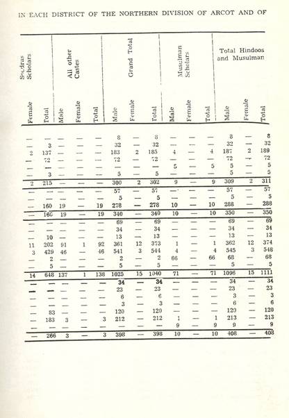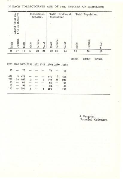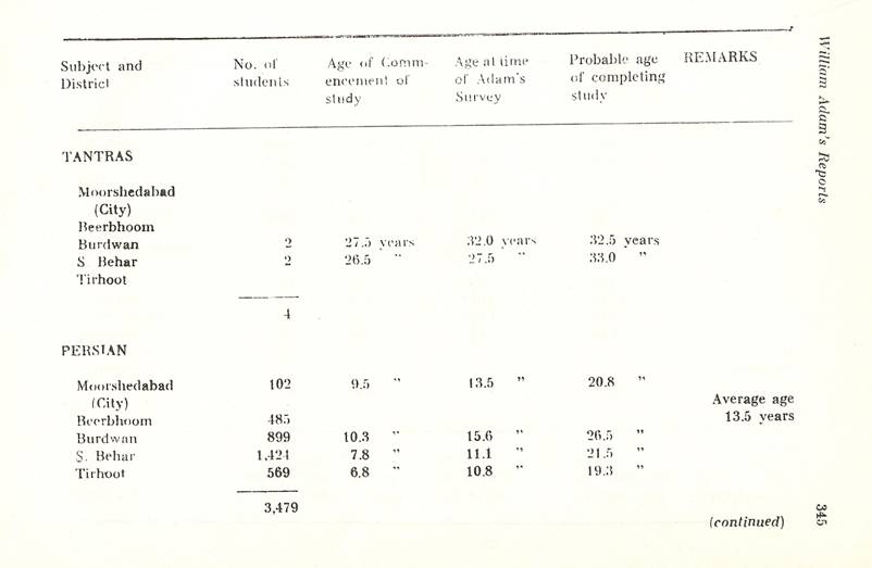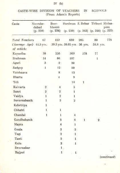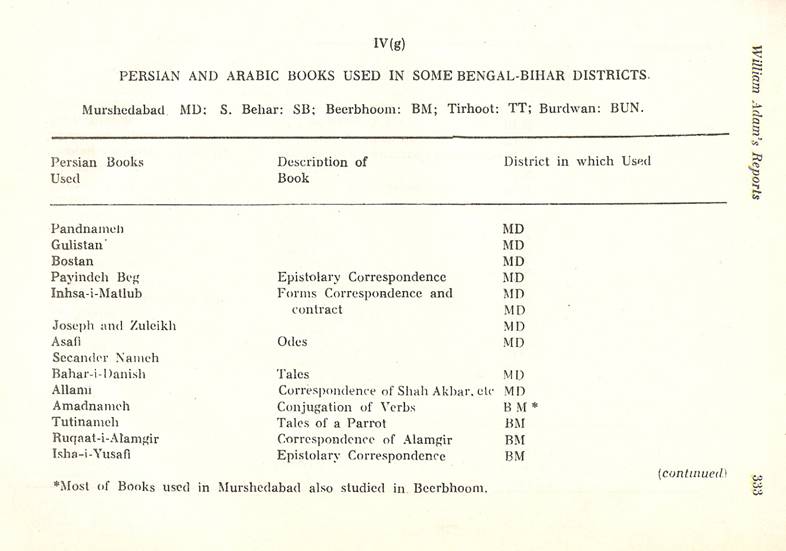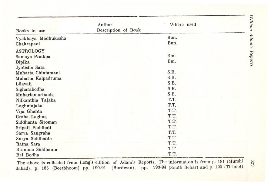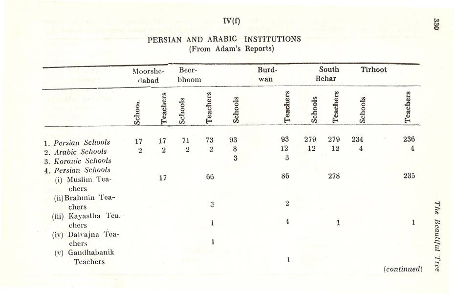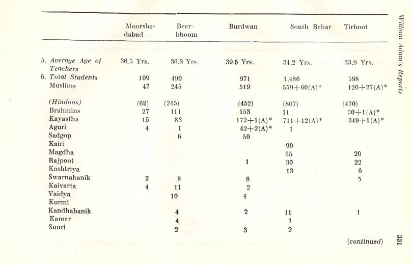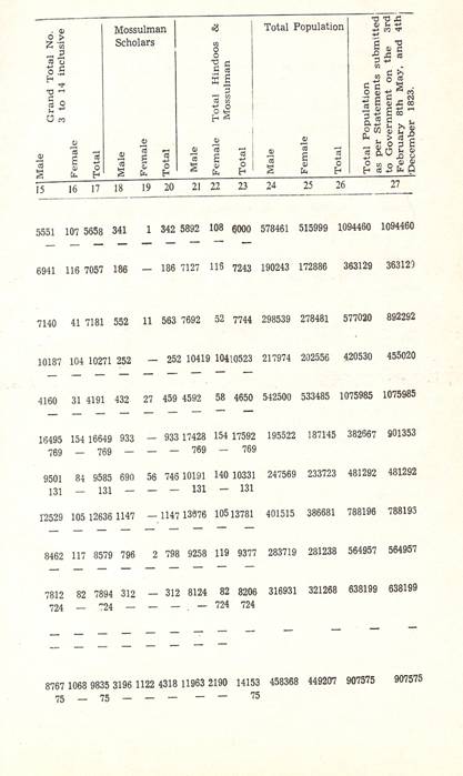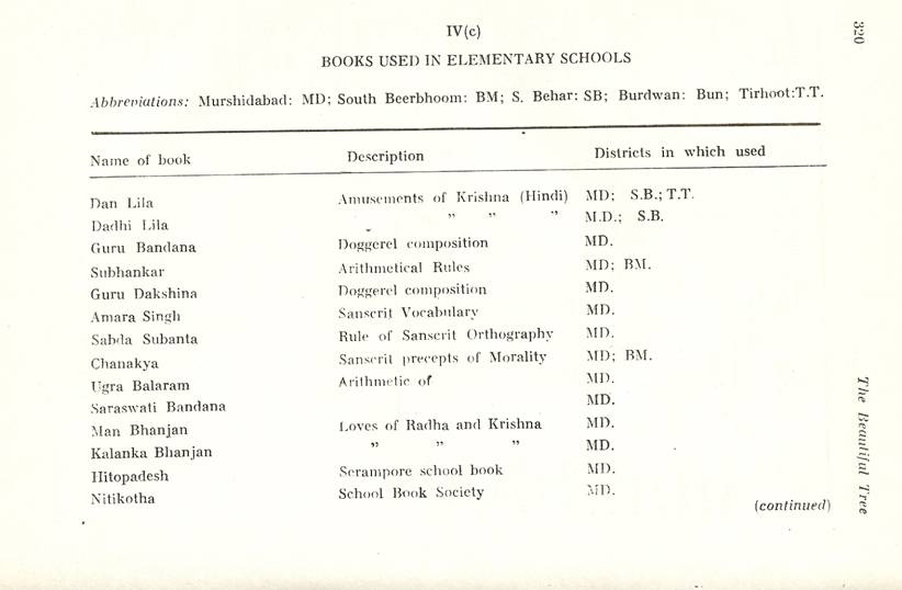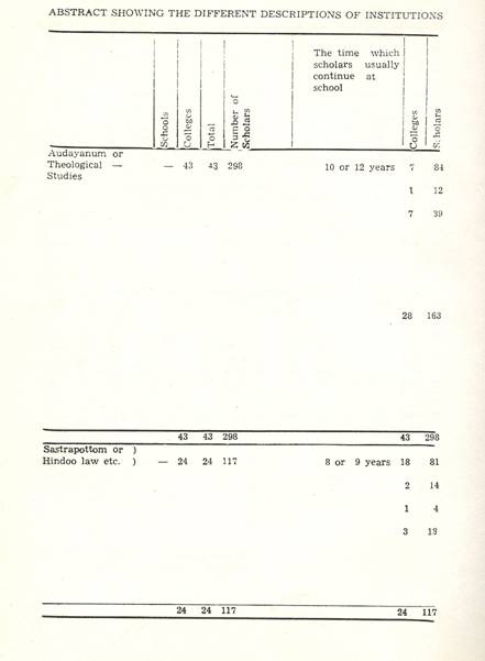 Schools of Learning, 297-316; Backergunge, 305-306; Beerbhoom, 308-310, Burdwan, 297-298; Chittagong 306; Dacca and Jalalpur, 305; Dinajpur, 312-314