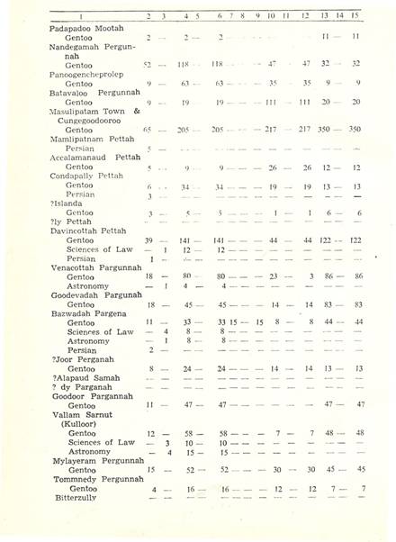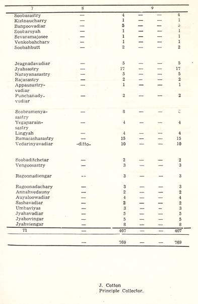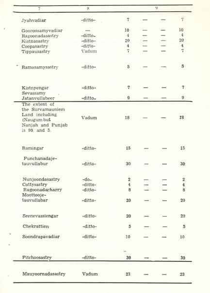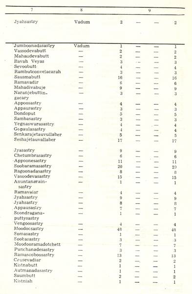 Chettrum at Trivalore for the Benefit of Pilgrims to Raumaswarum To a Chottarum on Island of Raumaswarum for the Benefit of Pilgrims To Teyagaraujaporum Chuttrum To Strepaudaswamy Church at Nauchiargoody To Punchaupeshaca Sastry To Ramah Sastry To Treyemback Isswrar Calender Bramin To Mirtinja Jose To Gopaula Jose To Vencata Jose To Chundracara Jose To Baulakistna Jose To Soobbah Jose To Jyaviyengoor Jose To Aunayarovan Paroomparien |